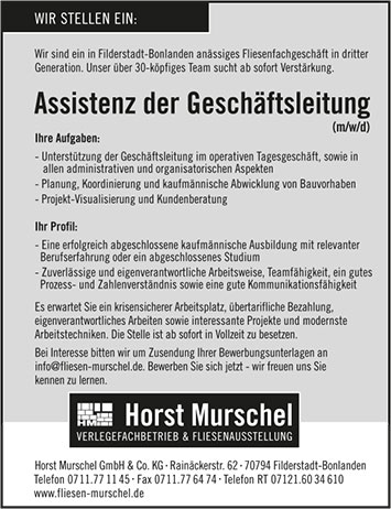 Die Stellen sind ab sofort zu besetzen. Bei Interesse bitten wir um Zusendung Ihrer Bewerbungsunterlagen an info@fliesen-murschel.de